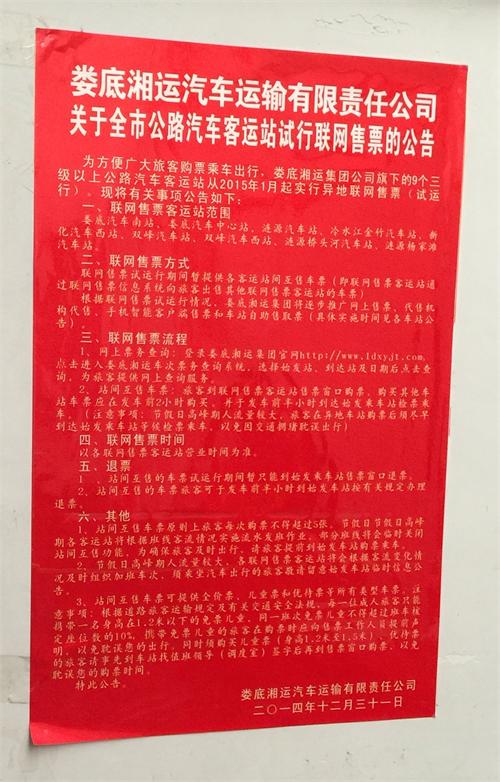 2015年春運(yùn)將至,為方便市民購買回家車票,給廣大市民提供快捷、優(yōu)質(zhì)的出行服務(wù),婁底湘運(yùn)公司創(chuàng)新客運(yùn)售票服務(wù)方式。從元月8日開始,公司轄下的婁底汽車站、婁底汽車南站、新化汽車西站、冷水江金竹車站、雙峰汽車站、雙峰汽車西站、漣源汽車站、漣源橋頭河汽車站、漣源楊家灘汽車站九個客運(yùn)汽車站全面實(shí)行聯(lián)網(wǎng)售票,旅客可就近在其中任意車站購買其他車站始發(fā)車票!