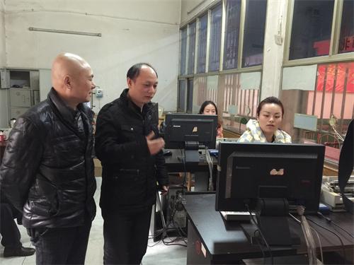 公司董事兼副總經(jīng)理陳夢麟(左二)、總經(jīng)理助理、婁底汽車站經(jīng)理?xiàng)罡渡ㄗ笠唬┮暡鞀涞灼囌韭?lián)網(wǎng)售票工作