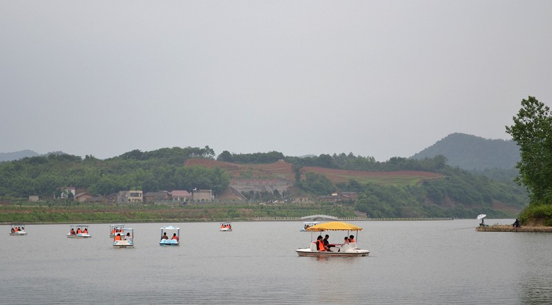 因先前聯(lián)系好了,山莊的王經(jīng)理早早就在等候我們,她把游玩的票發(fā)給大家。大家開始放飛了!有垂釣愛好者拿著早早準(zhǔn)備好的釣桿開始在河邊占地盤,喂魚食,裝蚯蚓,靜坐,大有一副姜太公釣魚之勢!不禁猜他們真正想做的不全是釣魚,而是一種心境!有的結(jié)伴沿著“湘軍橋”觀賞曾國藩、左宗棠筆墨,大聲朗誦詩詞,頗有文人風(fēng)范;有喜歡劃船的同事們來這尋找童年的步伐,三個(gè)一行,五個(gè)一伙,為安全起見,每個(gè)船上坐一位男同胞,漾著小船在河中嘻水,唱山歌;也有一些同事們爬山累了,就倚在河邊的竹亭里休息,微風(fēng)拂面,看白鴿群舞,觀孔雀開屏,拋開一切煩惱和壓力,享受著大自然的寧靜和怡然,愜意!