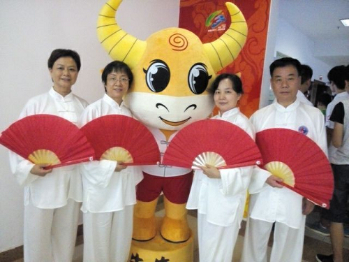 “白袍紅扇功夫令,削撩架推手法精,剛健優(yōu)美韻味純,自強(qiáng)不息太極人”,開(kāi)幕式的第四個(gè)文藝表演節(jié)目,是充滿飄逸美感和武術(shù)剛陽(yáng)之氣的太極功夫扇隊(duì)手持紅扇,伴隨著音樂(lè)表演,精彩的表現(xiàn)贏得了觀眾的陣陣掌聲,來(lái)自湘運(yùn)太極站的李定紅、彭玉梅、曾吉福、何文選四人的身影出現(xiàn)在了這支優(yōu)秀的表演隊(duì)伍中。這四人通過(guò)層層選拔脫穎而出,被選入開(kāi)幕式太極功夫扇表演隊(duì)。為了備戰(zhàn)開(kāi)幕式表演,在兩個(gè)多月排練中,他們克服天氣炎熱、訓(xùn)練強(qiáng)度大等困難,全身心投入到訓(xùn)練中,充分展示了婁底湘運(yùn)人團(tuán)結(jié)向上,勇于拼搏的精神。
